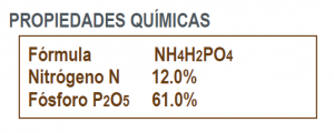 contenido de Fósforo (61 unidades), lo que hace que sea fácil y económico de aplicar. Se obtiene por neutralización del Ácido Fosfórico con el Amoniaco. Es incompatible con bases fuertes como Hidróxido de Sodio o cal ya que cuando entran en contacto se libera gran cantidad de amoniaco.