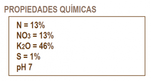 Fertilizante compuesto por Nitrógeno en forma Nítrica y Potasio libre de Cloro evitando la toxicidad por este elemento, es altamente soluble y puede utilizarse con éxito tanto en fertirrigación como en aplicaciones foliares. No deja residuos y por lo tanto no hay taponamientos en las líneas de conducción.